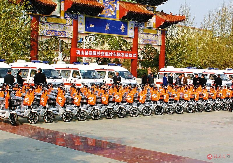 近日, 确山县举行健康扶贫巡诊车辆发放仪式。13辆健康扶贫巡诊车发放给县直4个医院及部分乡镇(街道办) 卫生院, 194辆健康巡诊电动车发放给194个扶贫村。