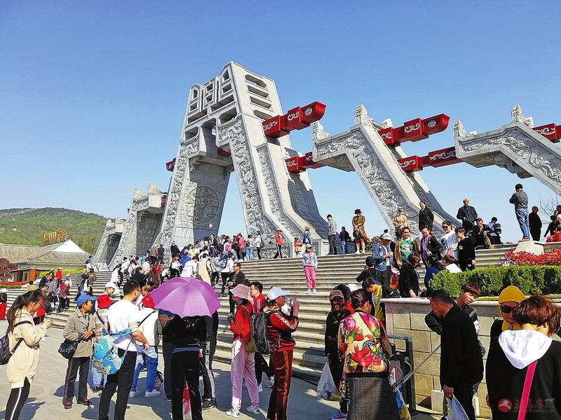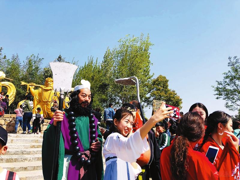 图①嵖岈山风景区游客争相与 “西游记师徒” 合影。