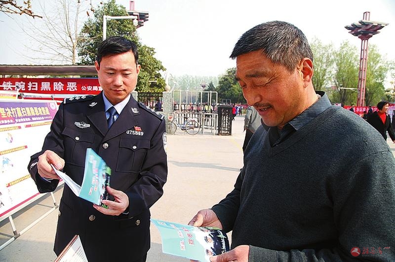 近日, 平舆县公安局组织民警在县城最繁华的舆新广场开展防范诈骗宣传活动。图为该局民警为群众讲解防范诈骗知识。