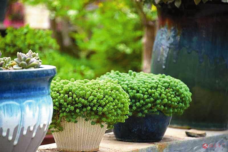 刚开始她种的多肉都是普通品种, 如胧月、 冬美人、 玉蝶等。后来, 她从外地引来很多新品种, 像唐印、 沙漠之翁、奶油黄桃、 碧桃、 婴儿手指、 蓝苹果等, 庭院里成了植物的王国。经过她的认真管护, 这些植物都长势良好。