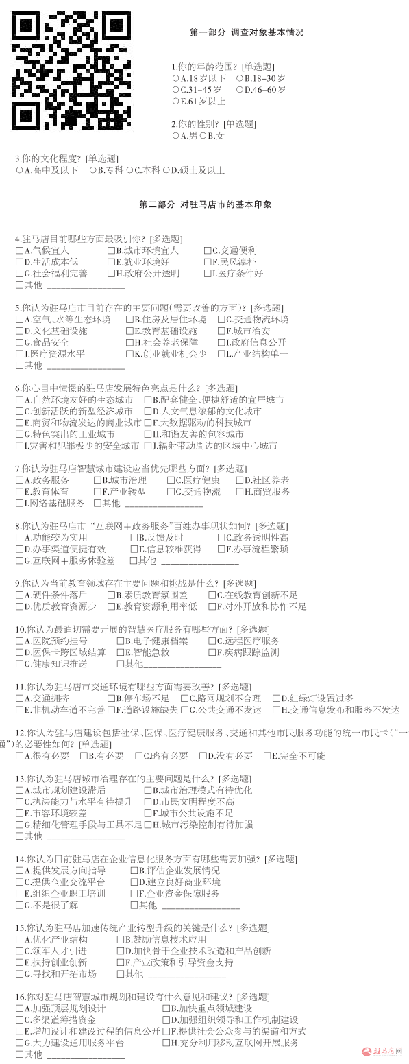 您好!新型智慧城市是通过新一代信息技术与城市发展战略深度融合, 推进城市高质量发展的新模式。为了解您对我市新型智慧城市规划和建设的意见或建议, 真诚地邀请您花两分钟时间填写问卷, 您的回答对驻马店智慧城市发展规划的编制十分重要。
