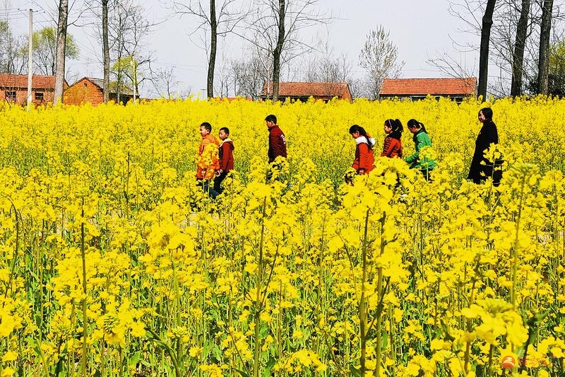近日, 一群学生走在正阳县傅寨乡付寨村的小路上。该村因地制宜, 把村庄美化和绿化有机结合起来, 不仅硬化了村庄道路、 安装了路灯, 还在房前屋后的空地上栽种果树、 油菜, 使群众的幸福指数节节攀升。 记者 杨军民 通讯员 贺永明 摄影报道