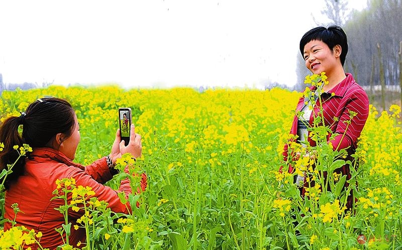 4月 14日, 在正阳县永兴镇天地情缘农民种植专业合作社的生态种植园里, 金黄的油菜花竞相争艳、 花香袭人, 游客赏花闻香、 拍照留影。通讯员 张 华 摄