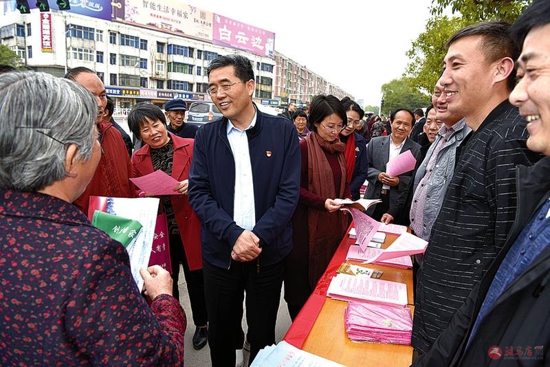 4月 15日, 平舆县举行了 “4 ·15” 全民国家安全日集中宣传活动。图为在活动现场, 该县主要负责同志与现场工作人员和群众亲切交流。