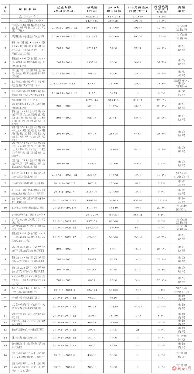 2019年县区属市重点建设项目1~3月份进度综合排序表
