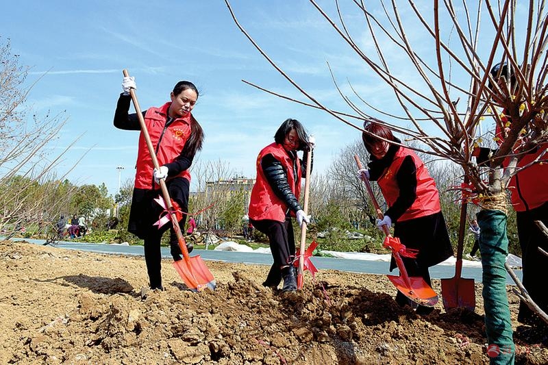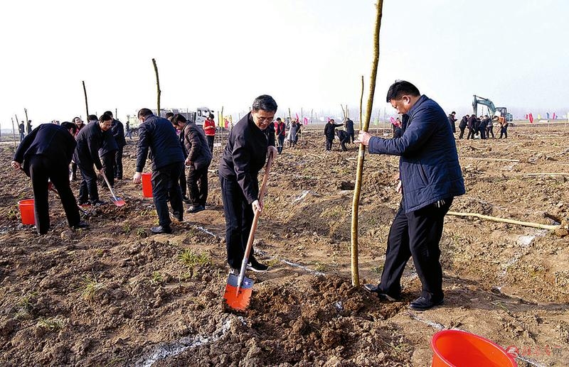 连日来, 在平舆县国道、 省道和县乡道两侧, 领导干部和志愿者积极参与植树活动, 场景一片火热。有的小心翼翼往坑里栽苗, 有的挥舞铁锹用力培土, 有的三五成群喊着口号合力将树苗抬进树坑、 回填泥土。大家分工协作、 有条不紊、 干劲十足, 一棵棵新栽种的幼苗迎风挺立。