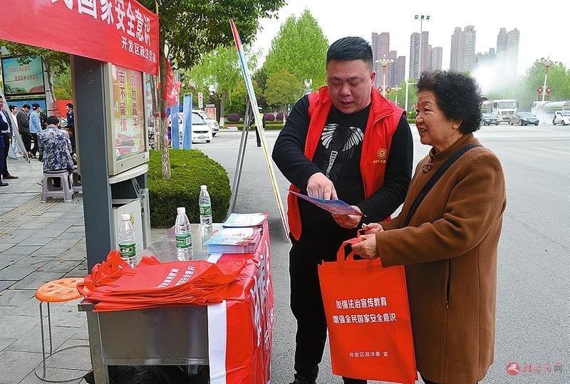 为加强全民国家安全意识,提高防范和抵御安全风险能力,营造和谐稳定的社会环境和良好的法治环境, 4 月 15 日, 开发区政法委组织各乡 (办事处) 和相关成员单位, 在市区天中广场西侧开展全民国家安全教育日普法宣传活动。此次活动, 开发区政法委制作了以 《国家安全法》 为主要内容的宣传展板, 印制 《宪法》 《国家安全法》 《反恐怖主义法》 等宣传单页, 通过向市民发放宣传材料、 接受过往群众咨询, 用市民喜闻乐见的方式将“国家安全依靠人民、 国家安全服务人民” 的思想观念告知群众, 让更多市民了解国家秘密的重要性, 着力营造 “国家安全人人有责” 的浓厚社会氛围。