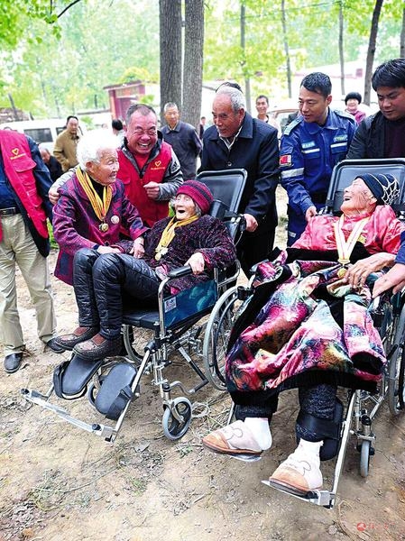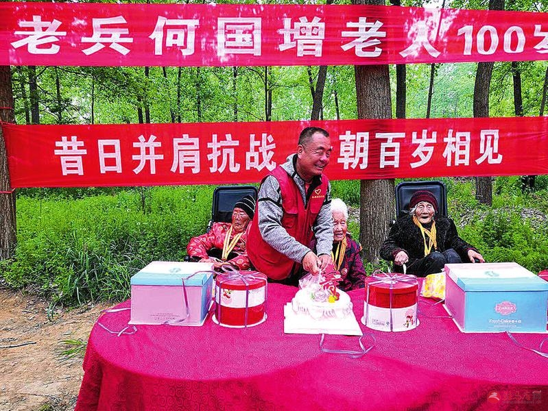 4月20日,“中国好人” 、 确山县志愿者协会会长张大生来到石滚河镇何大庙村何国增老人家中, 为这位昔日的抗战老兵庆祝百岁生日。当天, 张大生还把 100岁的董花、 98岁的周春霞两位抗战老兵接到何国增家中, 共同为这位百岁老人祝寿。记者 张新义 摄