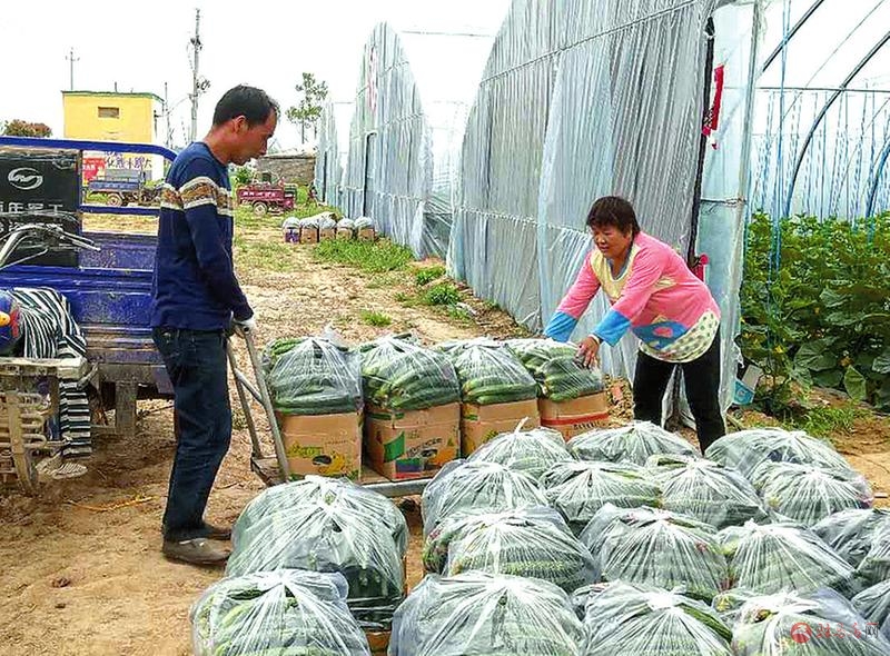 4月 19日, 上蔡县邵店镇高李村村民李国松正在组织当地村民采摘、 装运黄瓜。 据了解, 李国松承包了由帮扶单位省广播电视局 (原省新闻出版广电局) 捐建的 7座高标准日光温棚, 全部种上了黄瓜, 每个大棚纯收入可达2万元, 带动村民10余人就业。记者 陈 司 摄