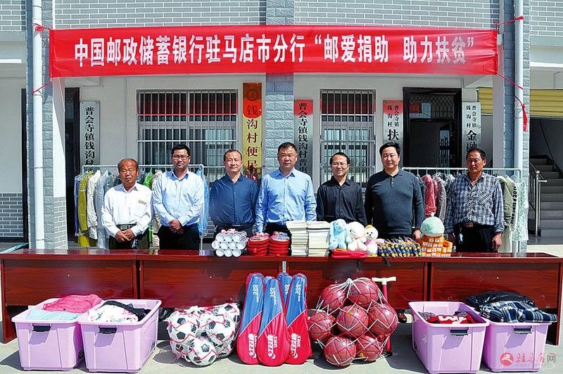 接着, 邮储银行驻马店市分行工会主席等一行前往该行定点扶贫村确山县普会寺镇钱沟村委开展捐赠活动, 除了全行干部员工捐赠的衣物、 玩具、 书包、图书等物品外, 该行工会还为钱沟村委小学新置了篮球、 足球、羽毛球、 乒乓球、 跳绳等文体用品, 关心关爱扶贫点青少年健康成长。