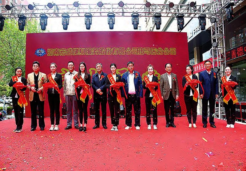 原 驻 马 店 市 政 协 主 席 邓 来法, 原驻马店市政协副主席闫超,原驻马店市政府党组成员、 市长助理陈国明, 原中国人民解放军总参谋部信息化部编研室主任吴建勋, 原驻马店军分区副司令顾苏河, 中国源色股份国际控股集团董事局主席吴四毛共同为河南宏盛健身服务股份有限公司驻马店分公司暨驻马店美域美家白金旗舰店开业剪彩。