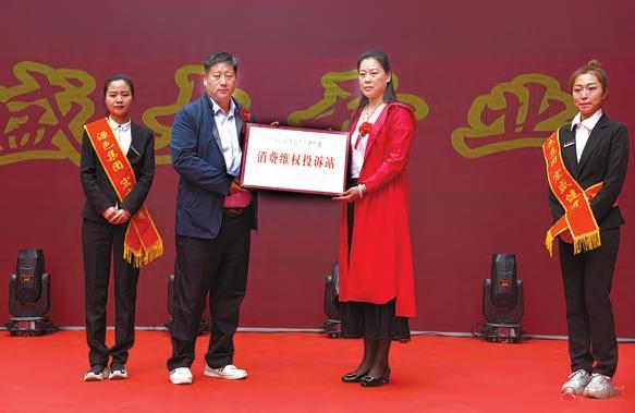 庆典仪式现场, 驻马店市消维会秘书长梁丽为吴四毛颁发消费维权投诉站牌匾, 欢迎消费者对河南宏盛健身服务股份有限公司驻马店分公司暨驻马店美域美家白金旗舰店进行消费监督。