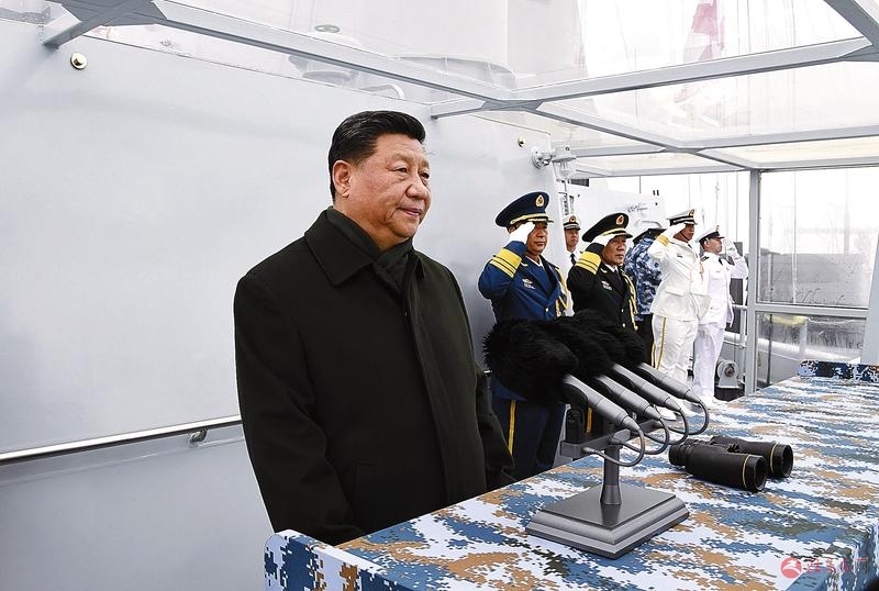 4月23日,在中国人民解放军海军70华诞之际,中共中央总书记、国家主席、中央军委主席习近平出席在青岛举行的庆祝人民海军成立70周年海上阅兵活动。图为习近平检阅舰艇编队。新华社记者李刚摄