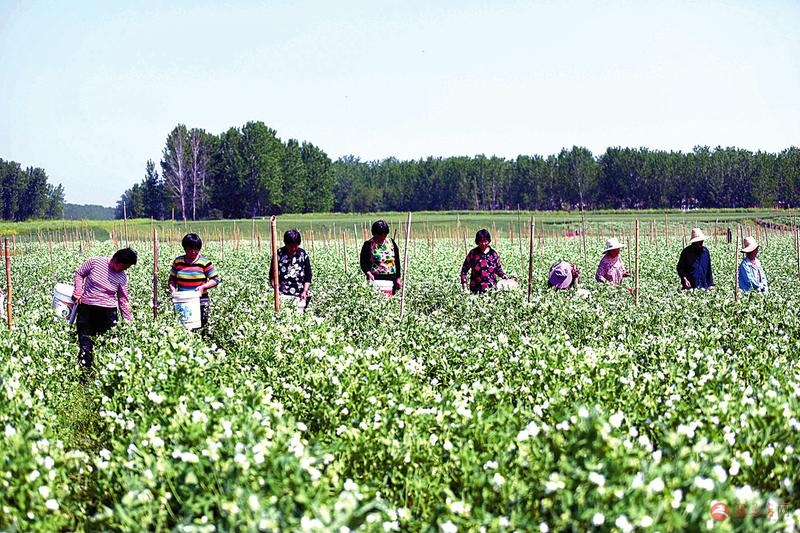 近日,新蔡县黄楼镇石湖村荷兰豆种植基地,群众正在采摘荷兰豆。村民黄彩峰从广东引进荷兰豆、甜豆等品种,在村里种植400亩,带动村民60户,订单产品远销北京、上海、福建等地,亩均收入6000元以上。