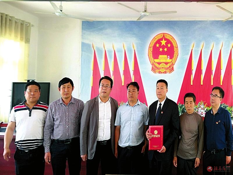 鄱阳县扶贫办为贺新义颁发荣誉证书,并与当地干部和王华星父子合影留念。