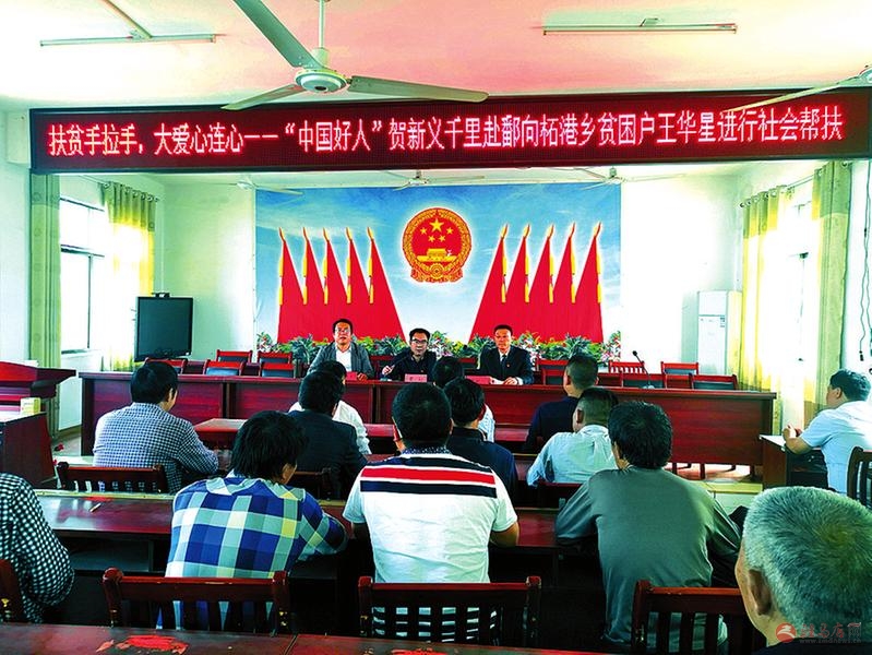 近日,“中国好人”、驿城区水屯镇孟庄村党支部书记贺新义千里奔赴江西省鄱阳县柘港乡九虞村贫困户王华星的家中,为王华星捐款20万元用于建设新房。
