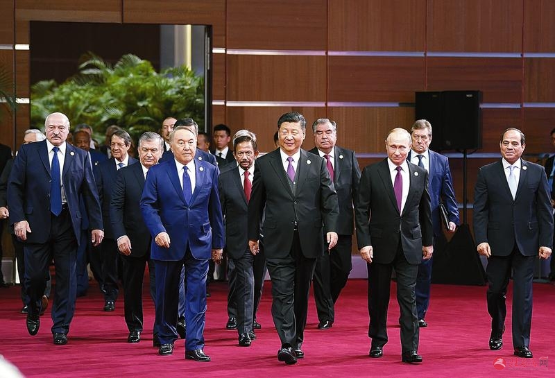 4月26日,国家主席习近平在北京出席第二届“一带一路”国际合作高峰论坛开幕式,并发表题为《齐心开创共建“一带一路”美好未来》的主旨演讲。这是习近平和出席开幕式的外方领导人共同步入会场。新华社发