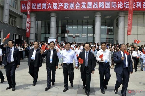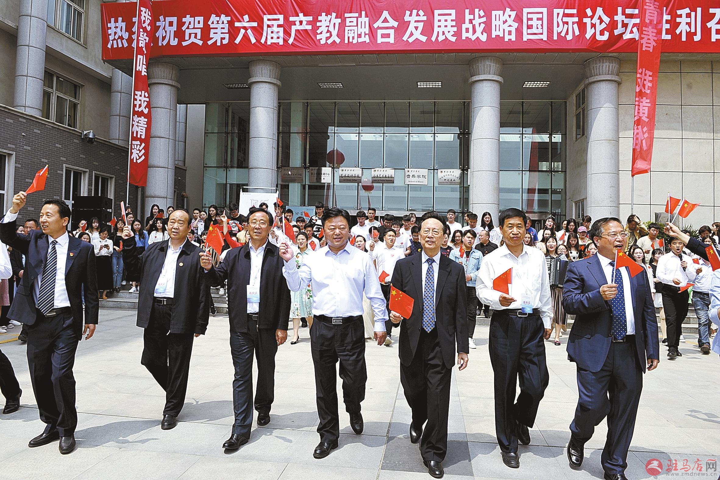 “我和我的祖国,一刻也不能分割……”5月17日,参加第六届产教融合发展国际论坛开幕式的陈昌智、陈星等领导和嘉宾来到黄淮学院与莘莘学子共同唱响《我和我的祖国》。记者 弓华静 摄