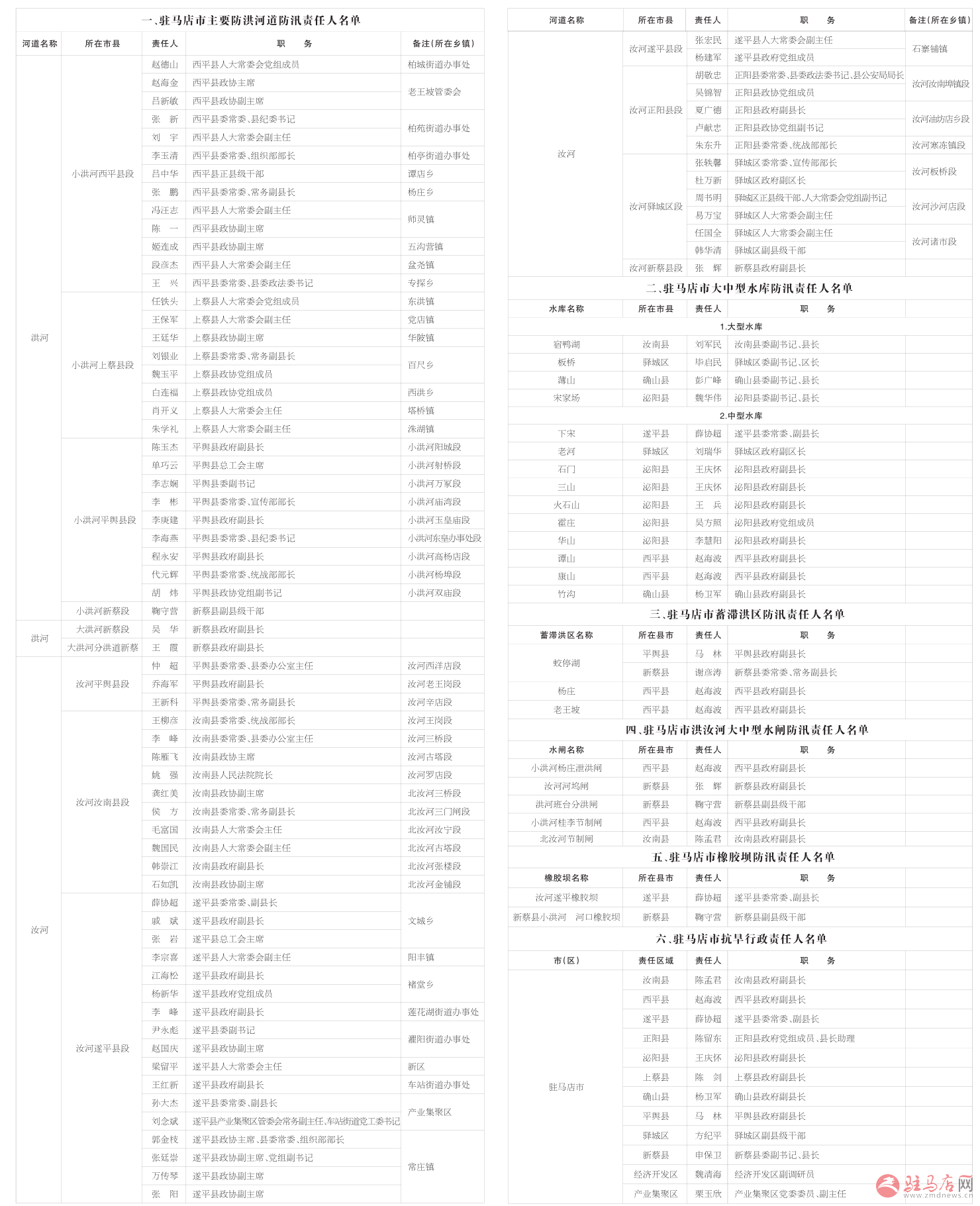 附件:驻马店市重点防洪工程防汛抗旱行政责任人名单