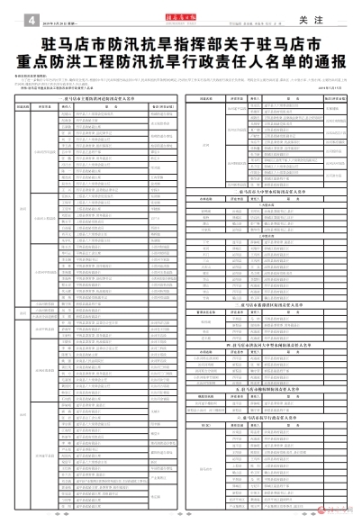 驻马店市防汛抗旱指挥部关于驻马店市重点防洪工程防汛抗旱行政责任人名单的通报
