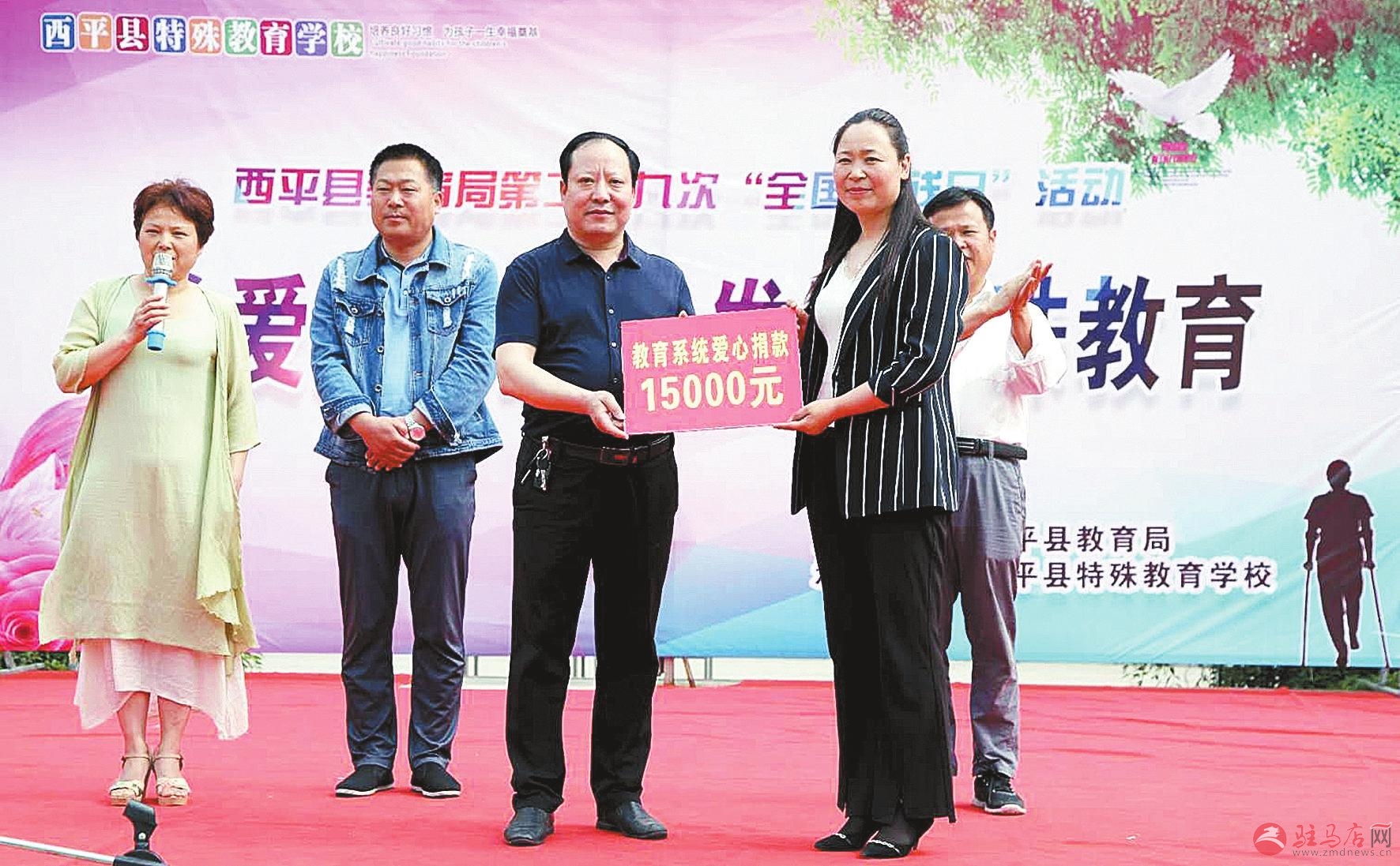 近日,西平县举行了第29次“全国助残日”活动。该县教育系统和爱心企业领秀服饰分别为西平县特殊教育学校捐助了1.5万元和价值2万元的爱心服装,为特教事业奉献了一份爱心。图为该县教育局负责人为学校捐款时的情景。