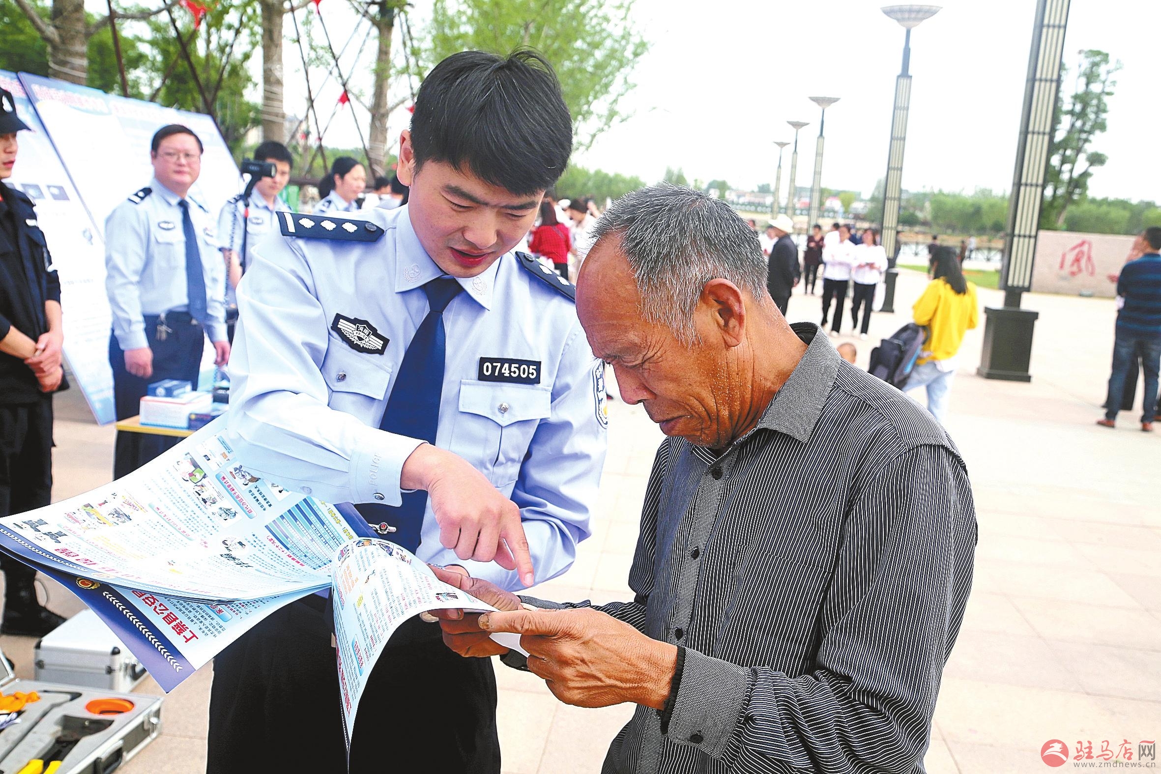 近日,上蔡县公安局深入社区、广场等人员密集地开展预防盗、抢、骗宣传活动。图为民警为群众讲解预防冒充军人诈骗知识。