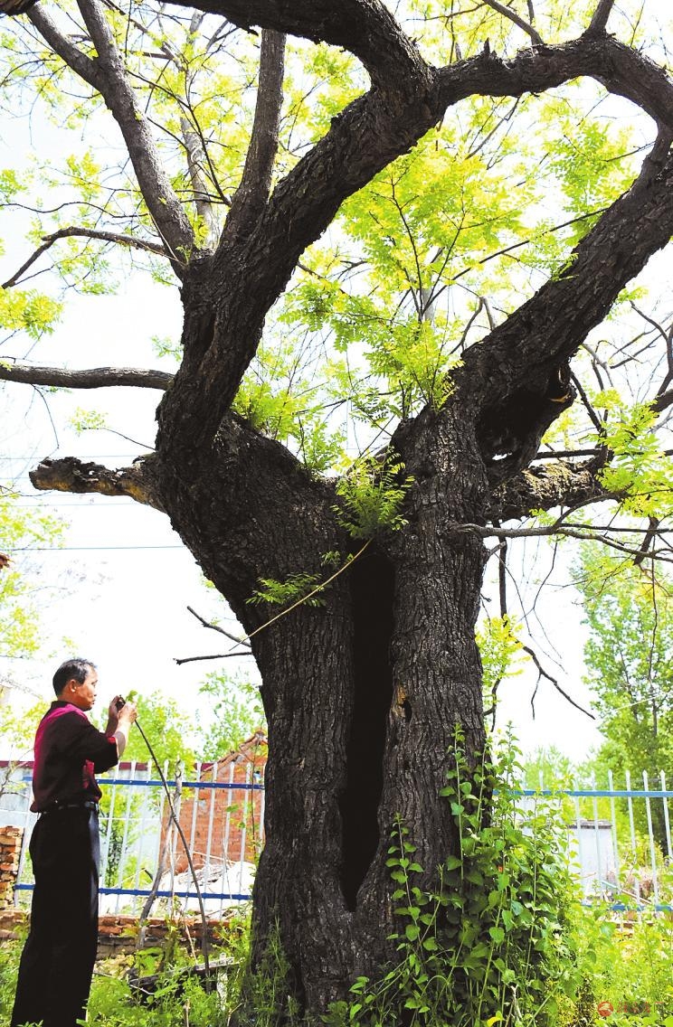 就在古墓群遗址东南部的闰楼村庄内,村民闰骆驼家门前有一棵槐树,据林业部门2017年普查、考证,距今已有500年历史,历经岁月沧桑、风霜雨露,依然枝繁叶茂。我们用手臂丈量一下,需要三四人才能环抱,树干中间形成的大洞能进去一个人。500年风雨沧桑留下的印记,虽然看起来它有些苍老了,但是依然张扬有力。