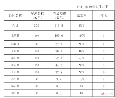 2019年驻马店市农村公路民生实事进度榜