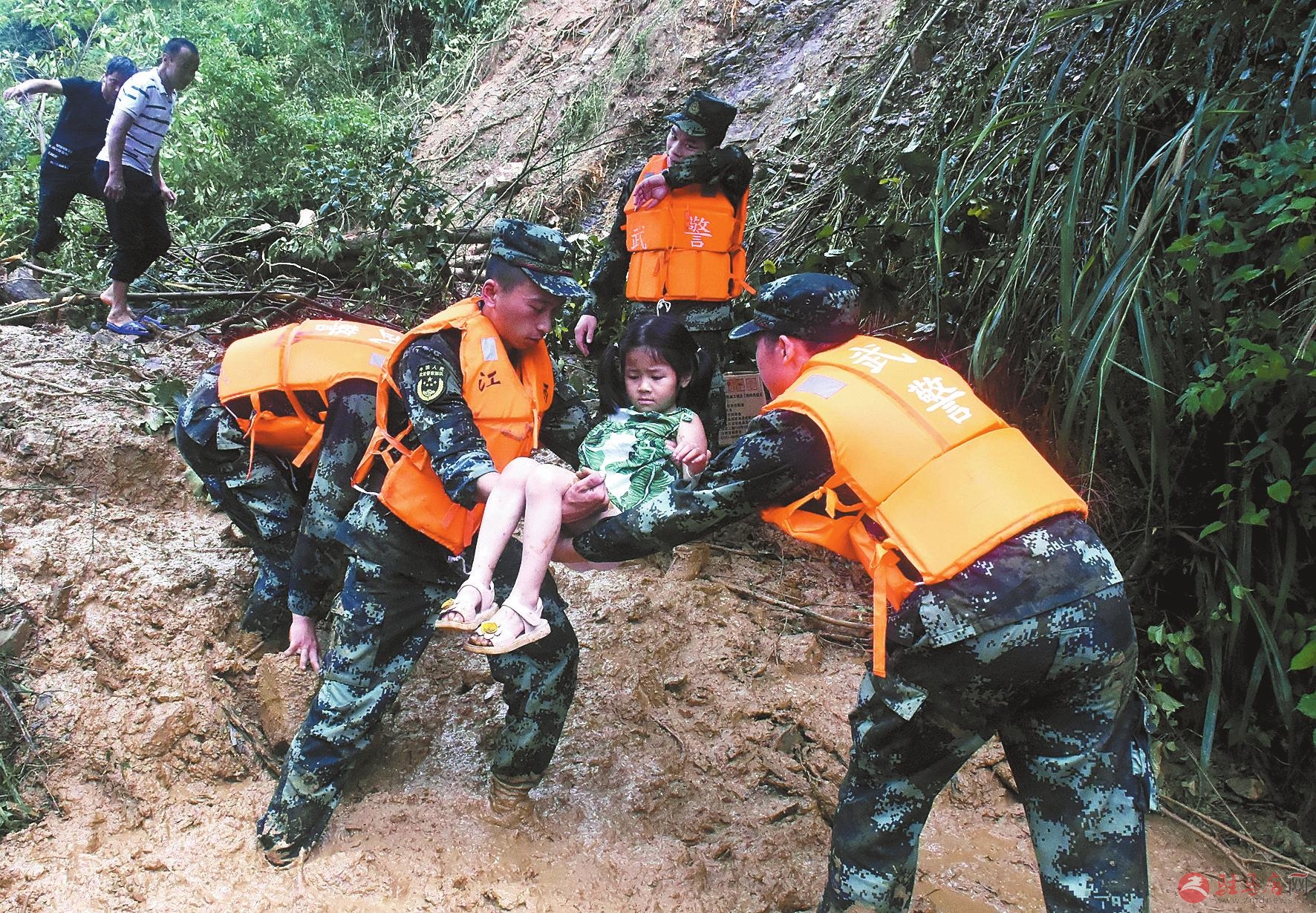 在江西省吉安市永新县高桥楼镇杉溪村,武警江西总队吉安支队的官兵帮助村民转移至安全地带。