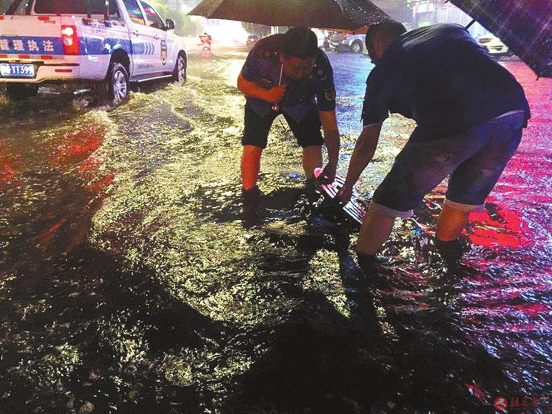 城管人员坚持徒步巡查,在发现积水后立即查明原因,并对堵塞区域的杂物进行清理和疏通。在部分积水特别严重的路段,他们打开下水道盖板或窨井盖,加快水流速度,从而降低形成内涝的风险。同时,为了过往群众的安全,他们还冒雨站在路边提醒过往行人和车辆;遇到一些市政设施被大风损坏,他们就停下脚步,对损坏的设施进行维修和加固。暴雨中的他们,成了西平县一道亮丽的风景线。