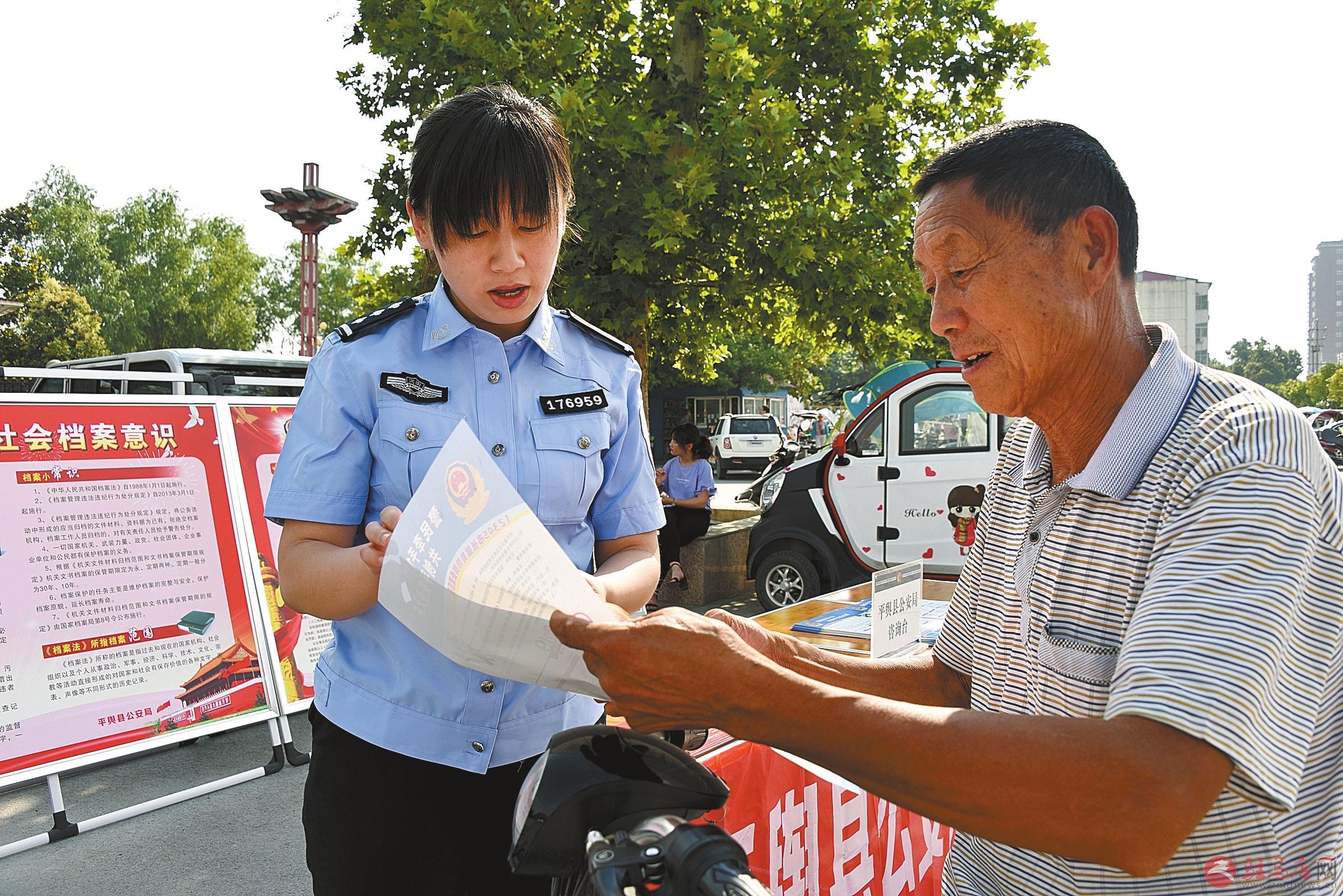 为庆祝新中国成立70周年,纪念第12个“6·9国际档案日”,充分展示档案工作服务经济社会发展、服务民生的重要作用,6月12日,平舆县公安局组织民警在中心地段开展国际档案日宣传活动,近距离让群众接触档案知识,学会利用、保护档案资源。此次宣传活动,共制作宣传横幅2条、宣传展板6块,发放宣传资料1000余份,现场接受群众咨询200余人次,增强了群众保护档案的意识,扩大了档案工作的社会影响力。图为民警正在为群众讲解有关档案知识。 通讯员 赵彦良 邓馨竹 摄影报道