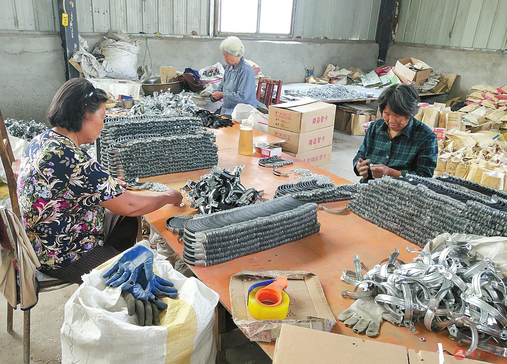 近日,上蔡县洙湖镇后店村群众正在村头的扶贫车间制作楼房排水管道钉卡。据介绍,该扶贫车间于2017年5月由上蔡县曹建磊建材销售有限公司投资兴建,生产楼房排水管道钉卡,技术简单易学、工作时间自由、劳动强度不大,主要招收当地的留守老人和留守妇女。至目前,该公司安排就业五六十人,其中贫困户26人,人均月增收千元以上。