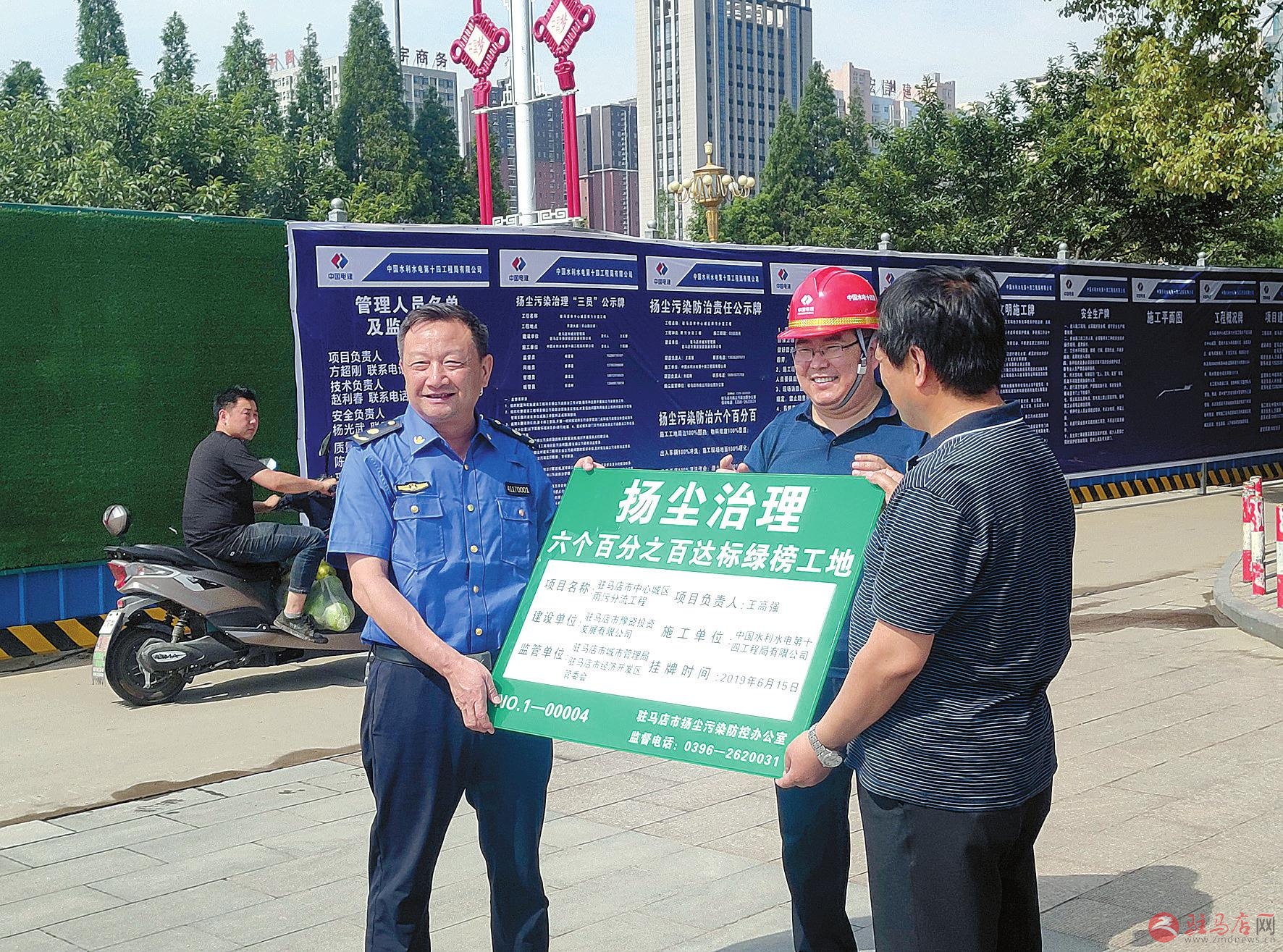 6月15日,在市中心城区雨污分流工程项目施工工地现场,市城市管理局负责人为该项目颁发扬尘治理达标绿牌。按照施工工地扬尘治理相关要求,该项目施工规范、措施到位、科学防尘、严格控尘,经过监管部门推荐和实地考察,被评为扬尘治理六个百分之百达标绿榜工地。记者 杨同山 摄