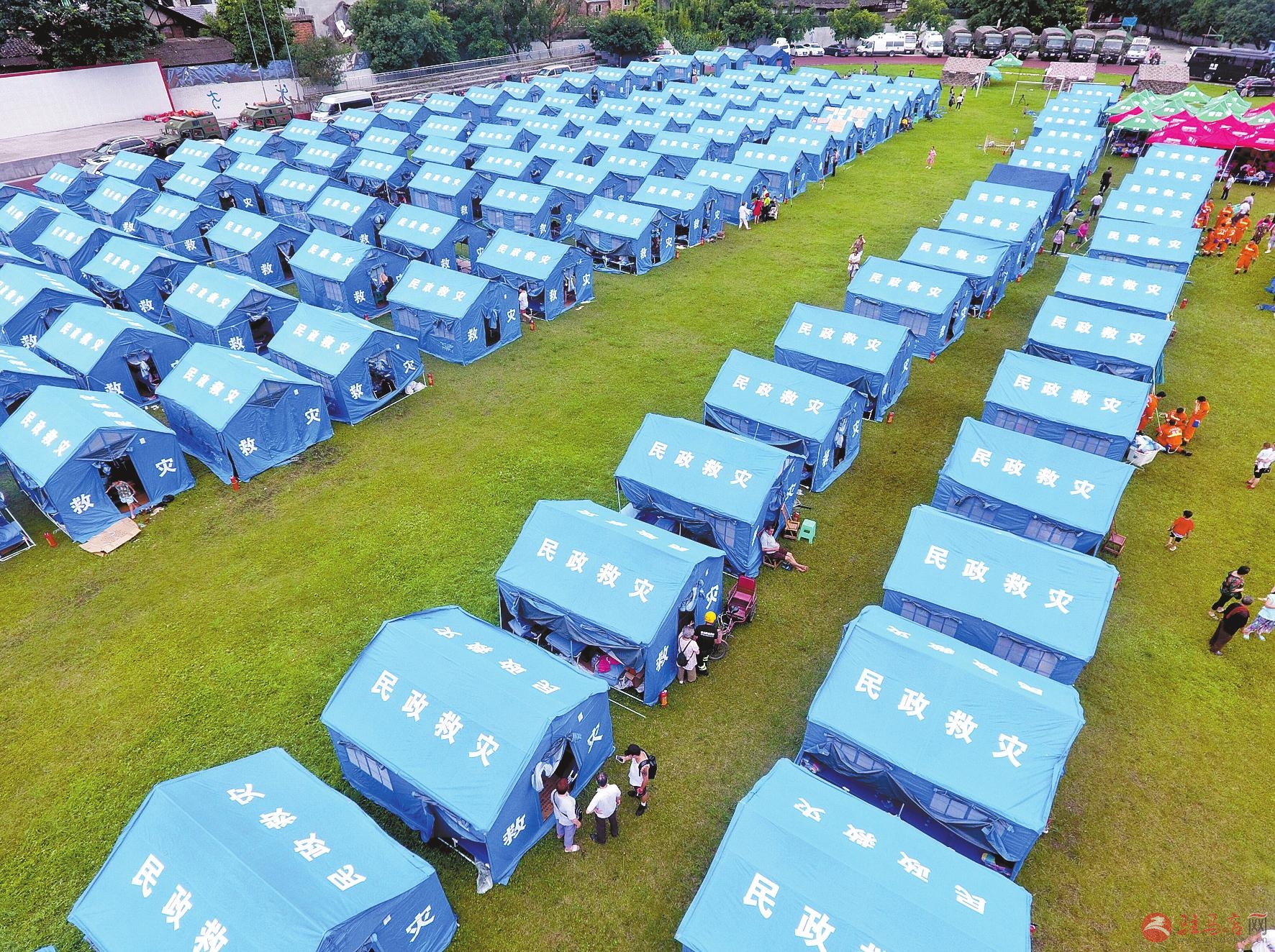 6月18日无人机拍摄的设在长宁县双河中学运动场上的临时安置点。截至6月19日13时,四川长宁6.0级地震已造成19.4万人受灾,因灾死亡13人,受伤211人。目前,受灾群众得到妥善安置,受伤群众得到精心救治。新华社记者 刘坤 摄