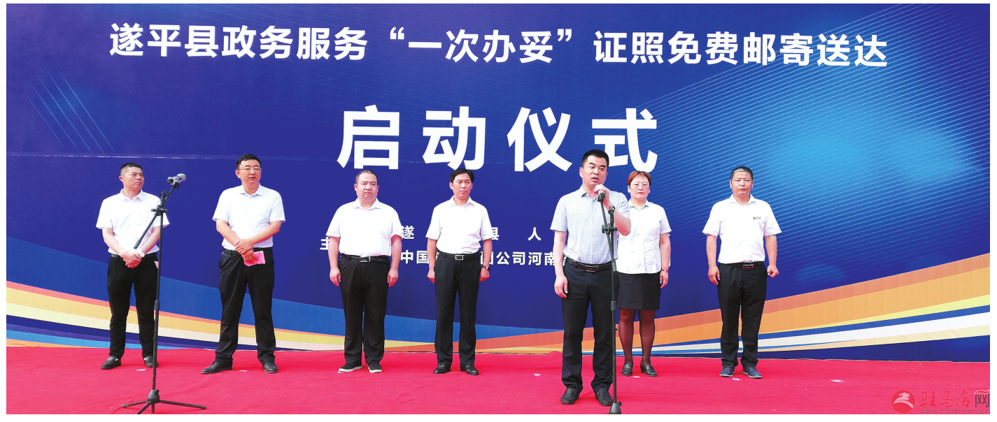 6月18日,遂平县政务服务“一次办妥、证照免费邮寄送达”启动仪式在县行政服务中心举行。县委常委、副县长孙大杰,县政府办公室主任位世锋,县政务服务中心主任张亮,市邮政分公司副总经理刘宏图出席启动仪式。