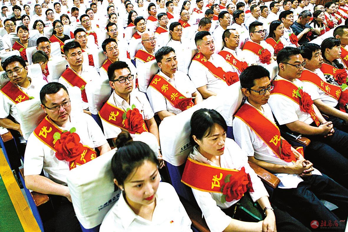 优秀党员和党务工作者胸戴红花准备接受表彰。