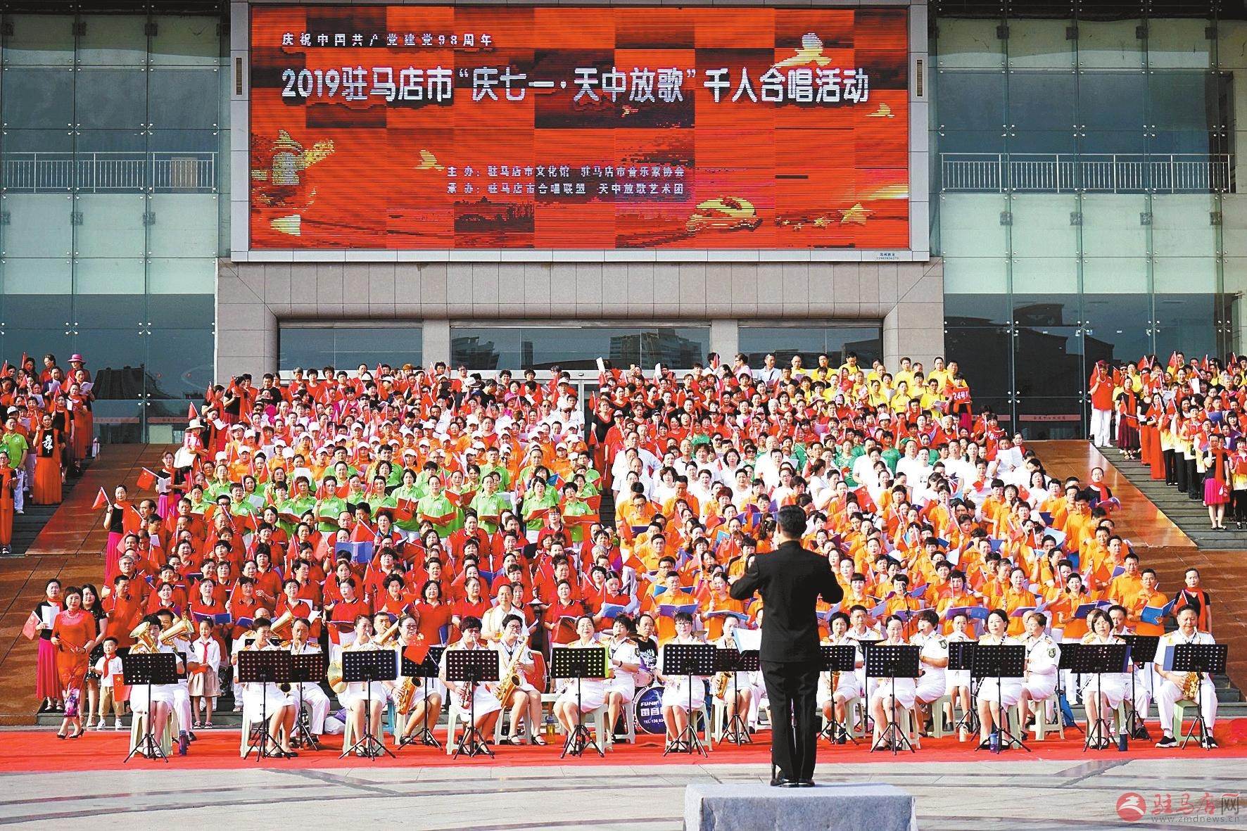 为庆祝中国共产党建党98周年,缅怀党的丰功伟绩,歌颂党的光辉历史,抒发广大群众爱党爱国情怀,6月30日上午,由驻马店市文化馆、驻马店市音乐家协会主办,驻马店市合唱联盟、天中放歌艺术团承办的2019驻马店市“庆七一·天中放歌”千人合唱活动在市区天中广场举行。33支来自我市不同社会团队的1200名群众参加合唱。