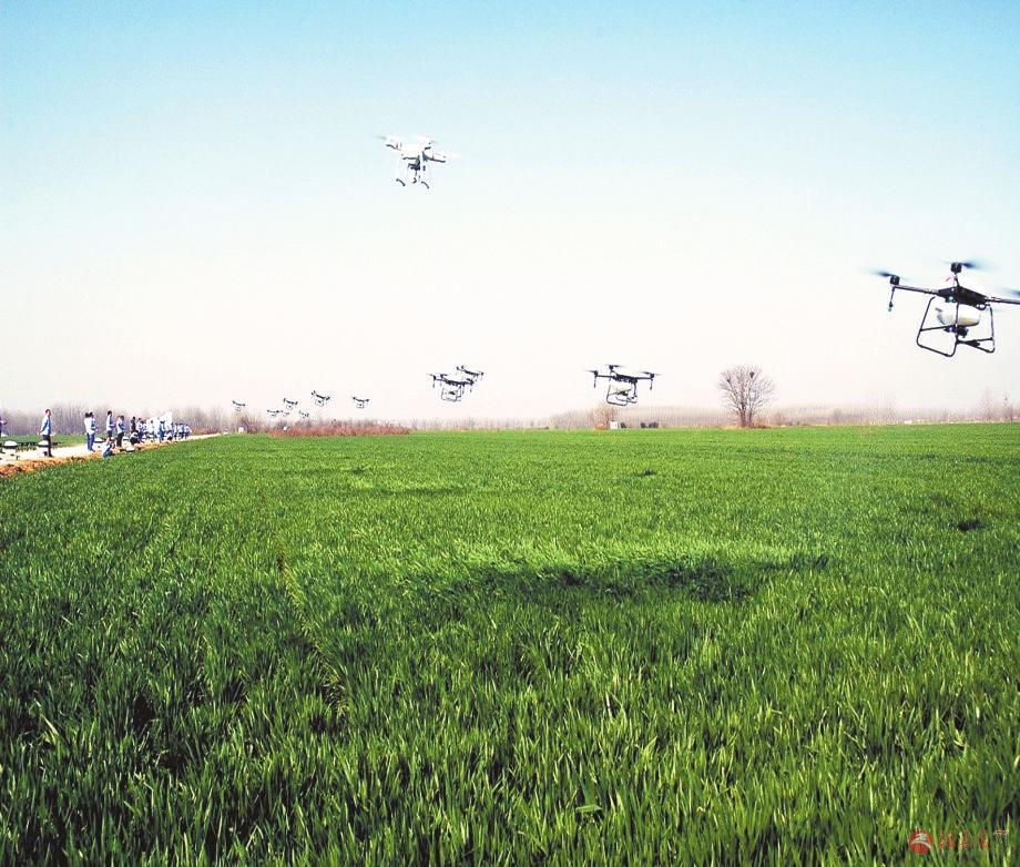 驻马店市新合作农资连锁有限公司利用植保无人机助力小麦“一喷三防”。