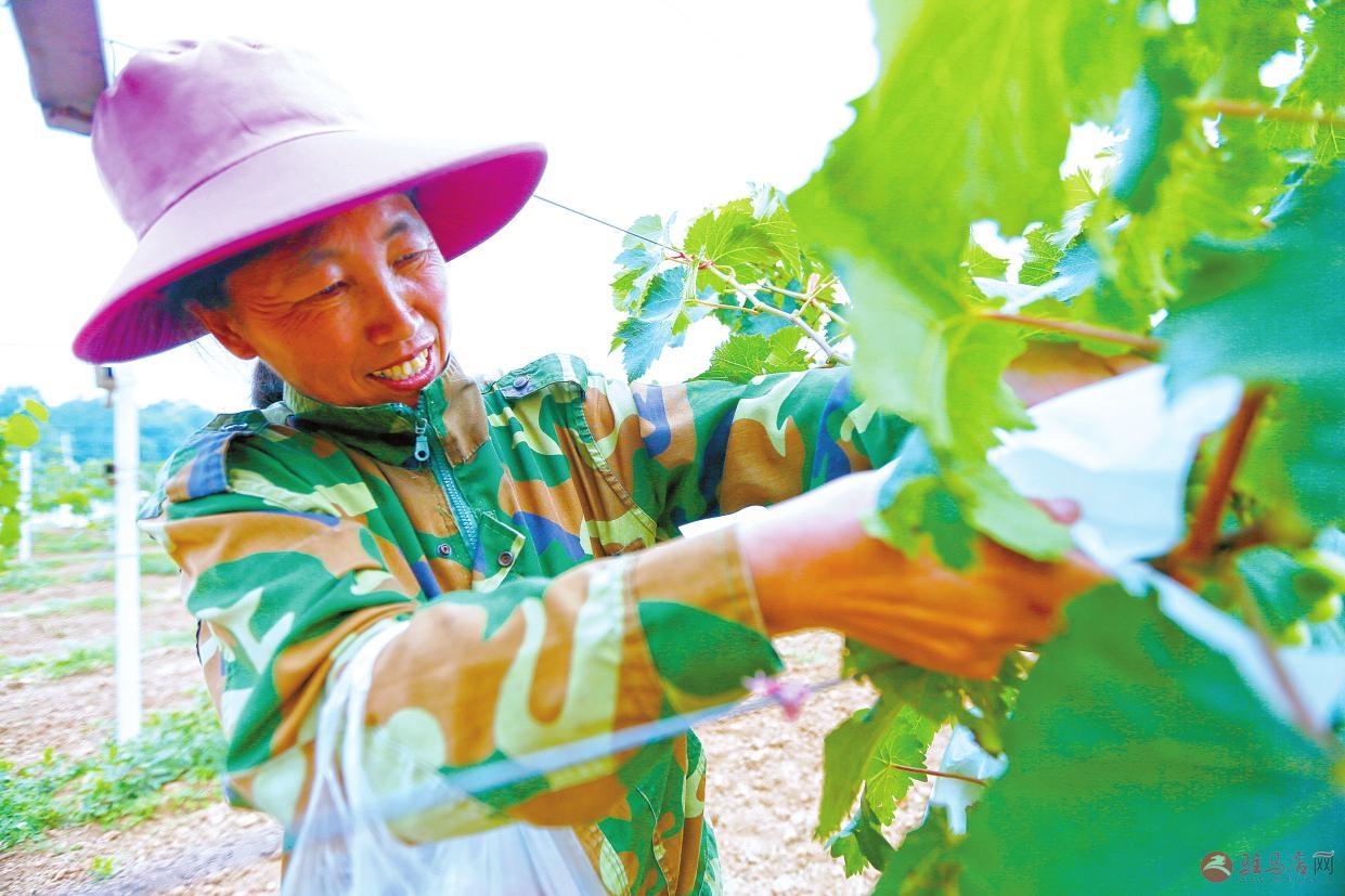 近日,村民在驿城区蚁蜂镇鲁湾小镇田园综合体无公害野生葡萄种植基地,给葡萄套纸袋以防鸟啄食和病虫害。