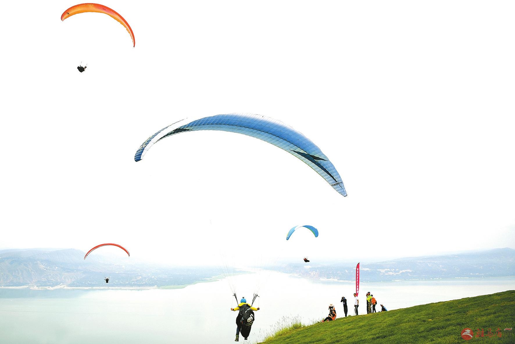 7月3日,参赛选手在比赛中。当日,2019年全国滑翔伞锦标赛在甘肃省临夏回族自治州永靖县刘家峡国际滑翔营地开赛。本次比赛为期七天,共有来自全国各地的60多名选手参加滑翔伞竞速飞行和定点着陆两个项目的角逐。新华社记者陈斌摄