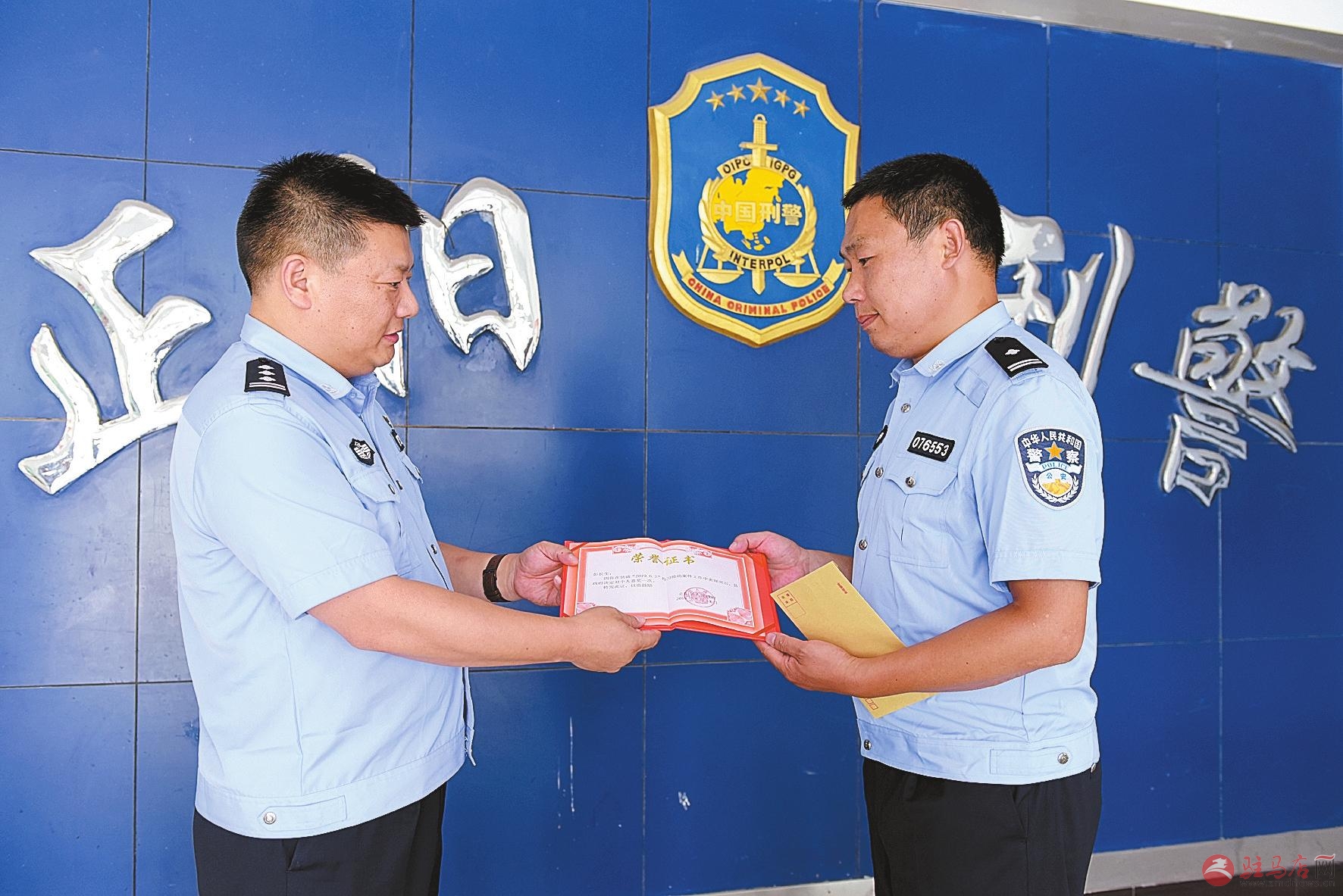 为迎接新中国成立70周年,发扬新时代人民公安铁军精神,激励广大公安民警士气,7月3日下午,正阳县公安局组织开展“为有功民警送奖上门”活动。图为该局相关负责人为侦破“6·2”持刀抢劫案件获得县政府嘉奖的民警进行颁奖。通讯员王艳摄