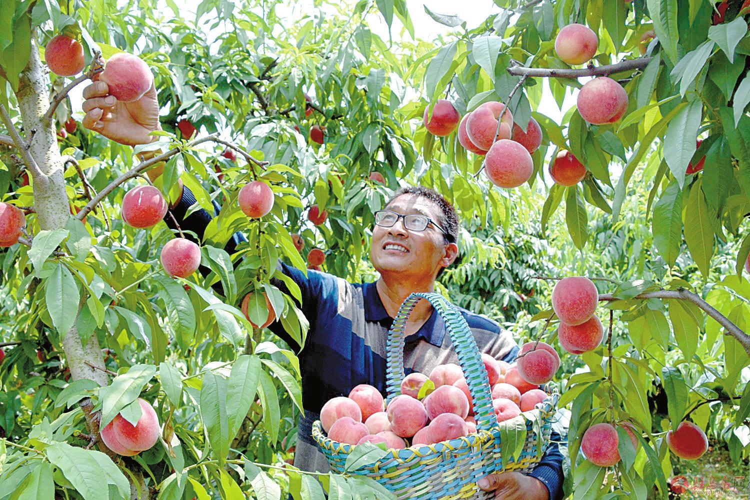 近日,正阳县油坊店乡赵店村刘东亚在采摘成熟的桃子。刘东亚是一位肢体残疾人,在驻村队员的帮扶下,2016年种植了12亩优质桃树,从去年起果树进入盛果期,每亩果树年收入达万元。2018年,他靠勤劳的双手摘掉了贫穷户的帽子。