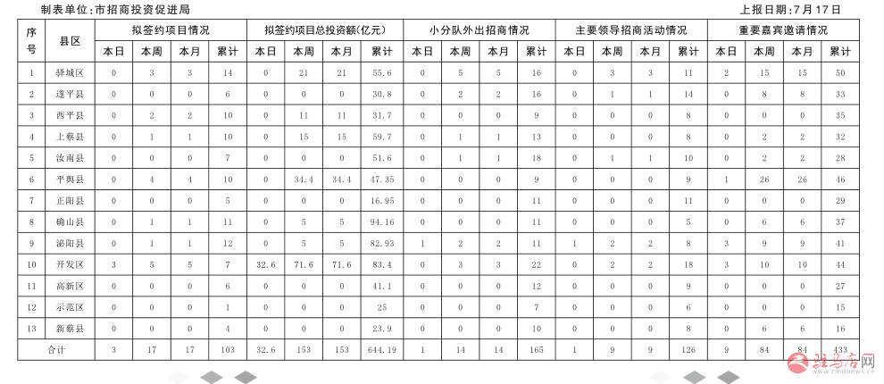 全市“迎盛会大招商”活动招商情况通报表(7月17日)