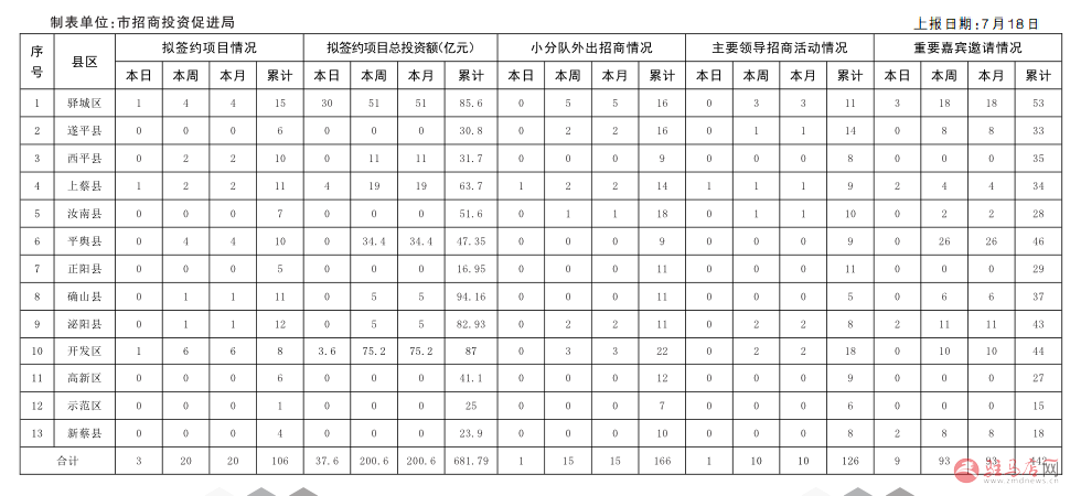 全市“迎盛会大招商”活动招商情况通报表(7月18日)