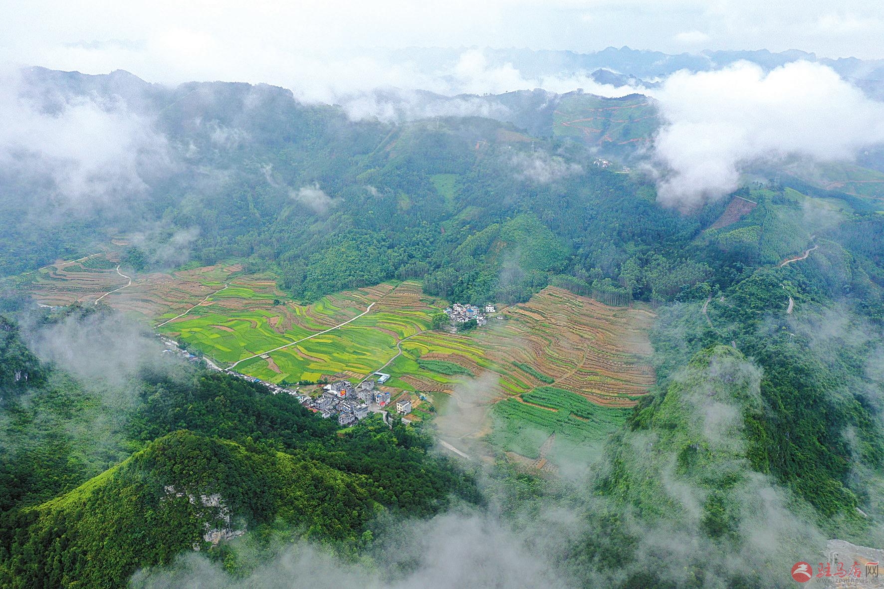 这是7月24日无人机拍摄的广西都安瑶族自治县下坳镇云雾缭绕的风景。
