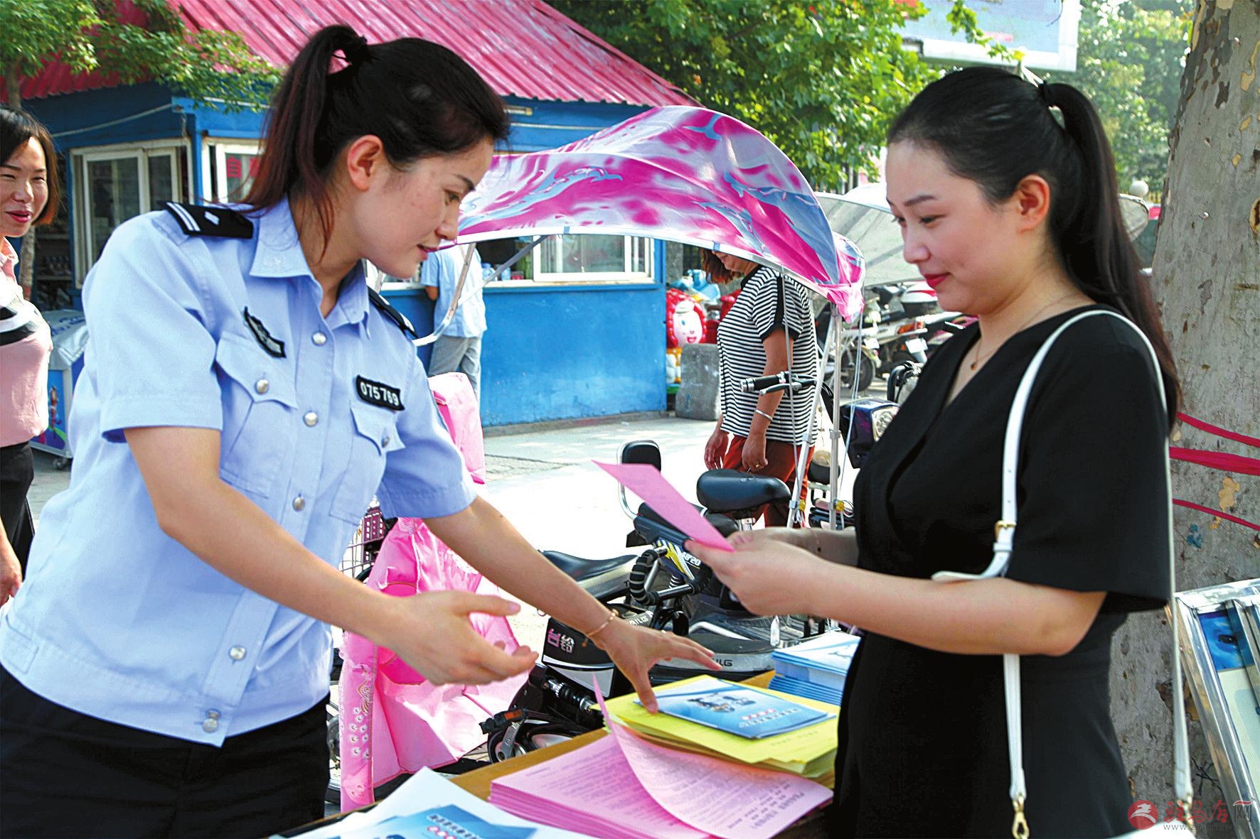 近日,平舆县公安局组织民警深入辖区、集市等人员密集场所,结合近期发案情况,开展安全防范宣传活动。图为该局民警在为群众讲解安全防范知识。通讯员赵彦良摄