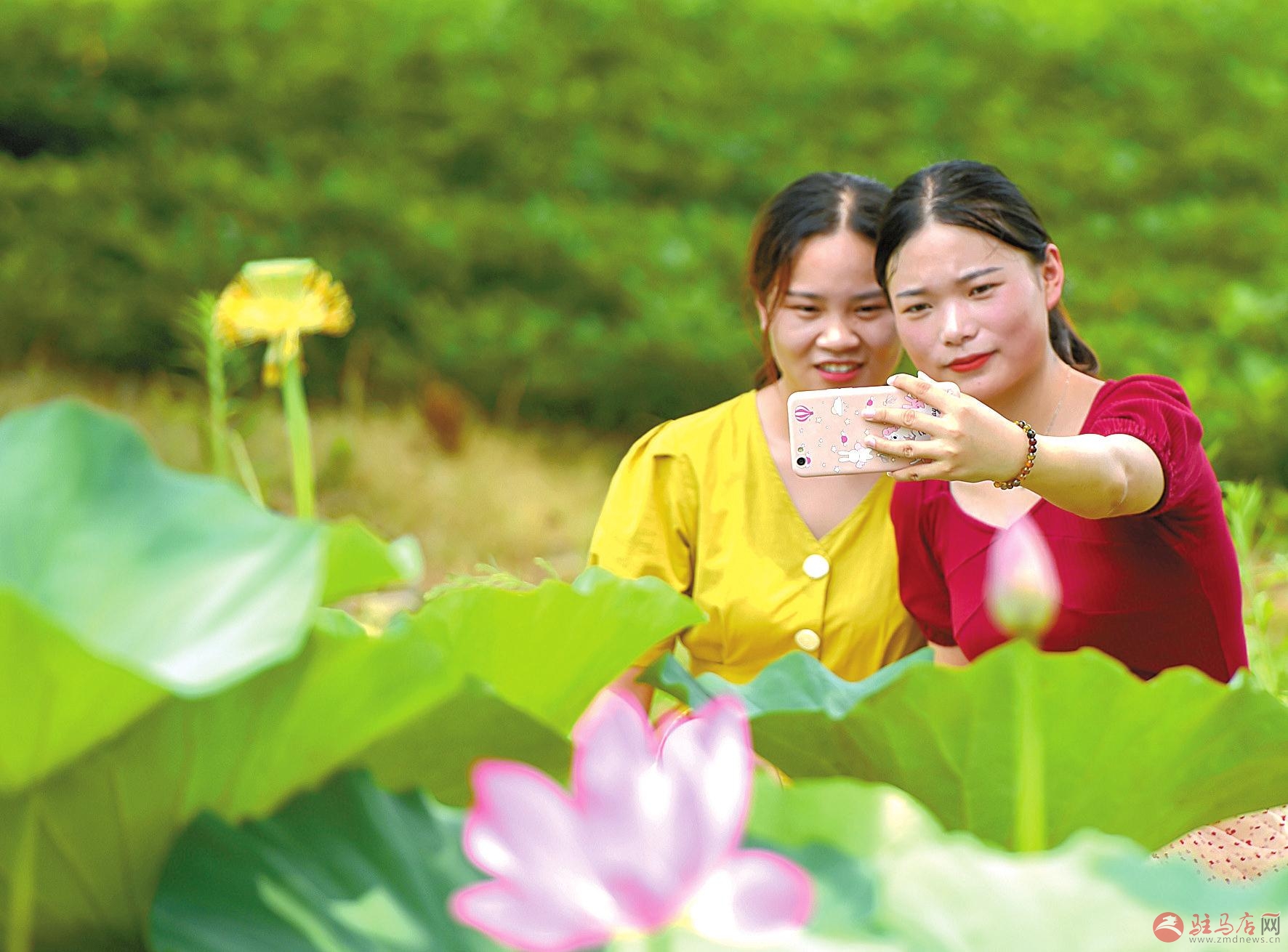 7月26日,在新蔡县顿岗乡路边一处荷塘里,两名游客正赏花拍照。