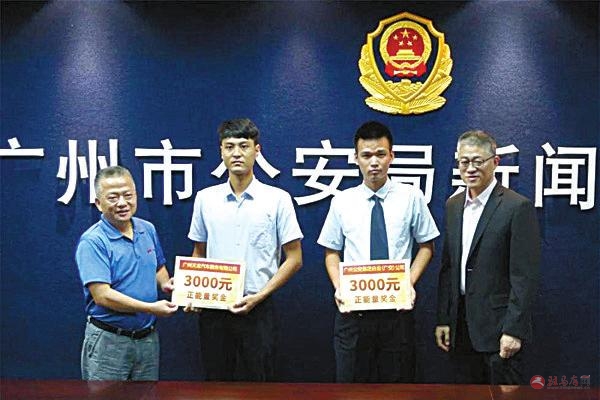 7月24日,广州警方举行新闻发布会,并为见义勇为的王海超(右二)和 邓伟强(左二)颁发正能量奖金。
