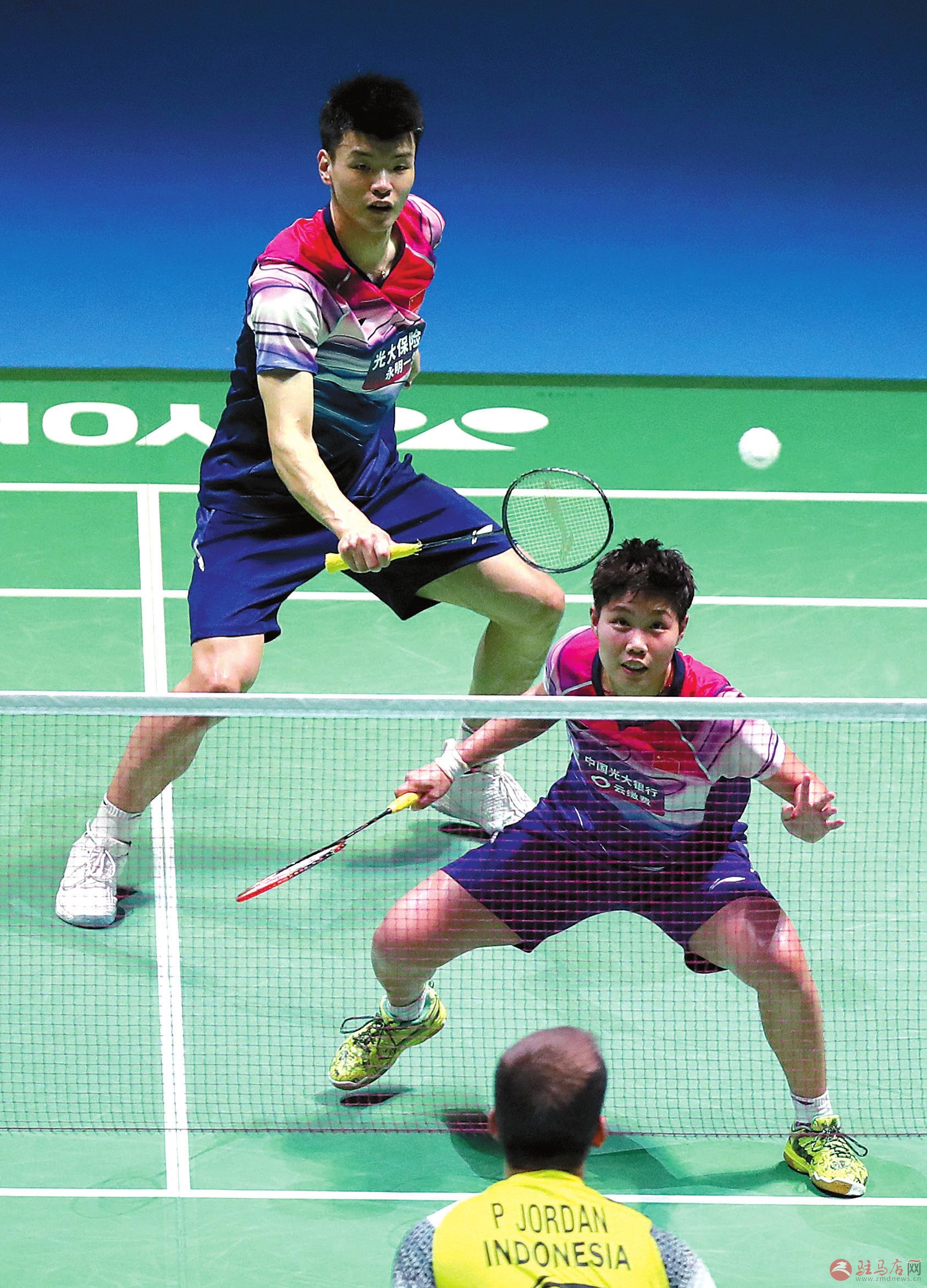 7月28日,王懿律(上)/黄东萍在比赛中。当日,在日本东京举行的2019年日本羽毛球公开赛混合双打决赛中,中国组合王懿律/黄东萍以2比0战胜印度尼西亚组合乔丹/梅拉蒂,获得冠军。