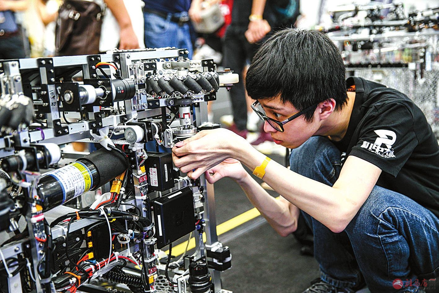 8月6日,选手在比赛准备区调试机器人。当日,第十八届全国大学生机器人大赛机甲大师赛总决赛在广东深圳拉开帷幕,来自国内外的32支战队闯入总决赛,1000多名参赛队员将带着224台机器人在6天时间内争夺冠军。